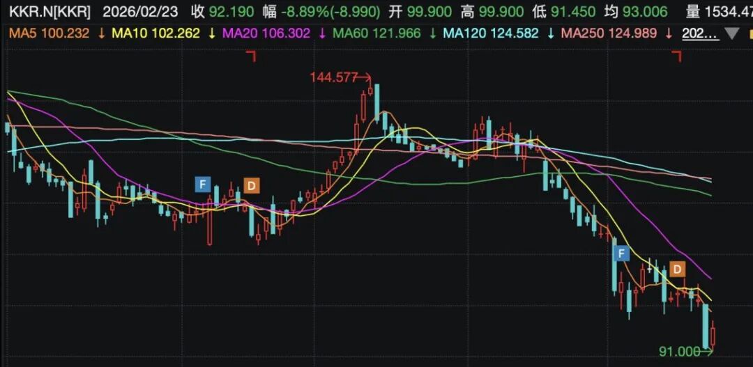 消息传出后迅速引发连锁反应,拖累资管板块集体下跌。2月19日,黑石、阿波罗全球管理等机构股价应声下跌超5%,KKR、Ares等同行也纷纷走弱。