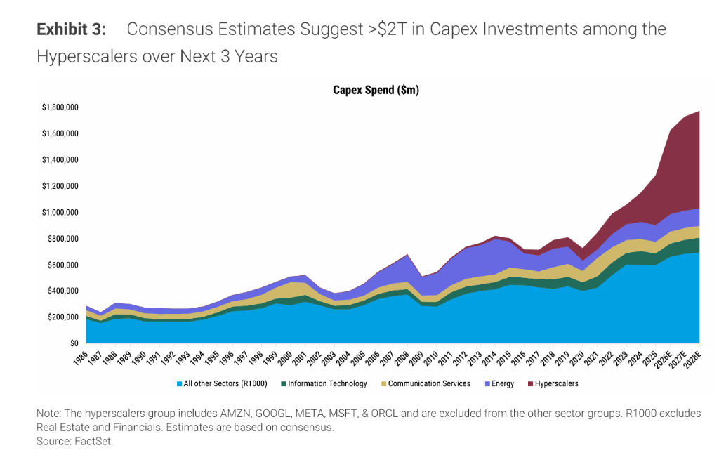 从对罗素1000指数的影响来看,2025年超大规模云服务商贡献了该指数资本支出增量的150%以上——意味着其余成分股的资本支出实际上在净收缩。超大规模云服务商资本支出同比增长约70%,而指数其余成分股则下降6%。摩根士丹利预计,至2026年,hyperscalers占罗素1000总资本支出的比重将达约40%,较2024年翻番,并可能于2028年进一步跃升至49%。