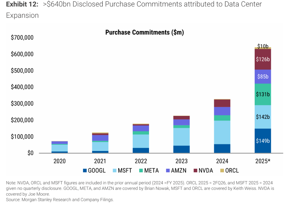 超大规模云服务商近期大规模扩大融资租赁使用,进一步抬高了实际资本强度水平。截至最新公司财报,这五家企业对未来租约的总承诺额已超过6600亿美元,其中甲骨文约2480亿美元,微软约1550亿美元,META约1040亿美元,亚马逊约960亿美元,谷歌约590亿美元。值得关注的是,谷歌的租约承诺自2024年以来增长约七倍,META同期增幅逾200%。