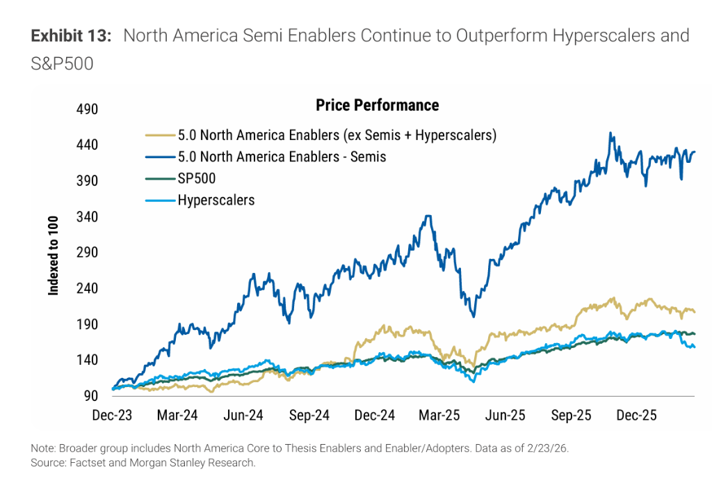 资本市场表现也印证了这一逻辑分歧。自2023年12月至今,北美半导体AI赋能企业的股价涨幅已分别超出超大规模云服务商和更广泛AI赋能板块272%和224%。市场目前更愿意为半导体企业已确定的近期盈利支付溢价,对于hyperscalers和更广泛AI赋能群体的收入兑现路径,则选择继续观望。