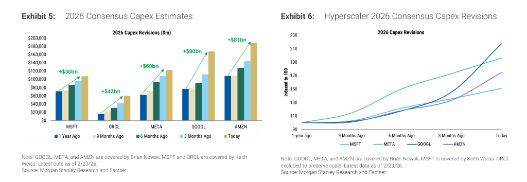 从单个公司来看,谷歌 2026年资本支出的一致性预期较一年前上调117%,META上调96%,亚马逊上调75%,甲骨文的修订幅度更高达264%。摩根士丹利分析师Todd Castagno团队指出,这些修订呈现"阶跃式"特征,而非渐进式调整,表明本轮投资周期极难预测——管理层持续更新数据中心扩建计划,各公司争相锁定关键供应链,进一步加大了预测难度。