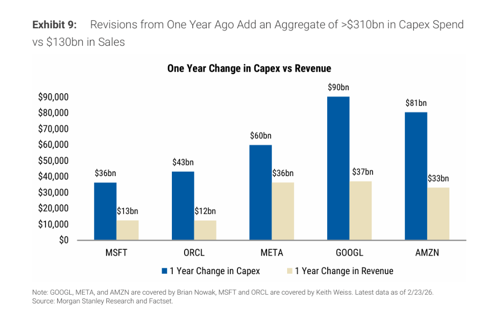 与资本支出预期的急速上修形成鲜明对比,收入修订几乎原地踏步,FCF预期则随之下滑。报告数据显示,在过去一年的2026年预测中,五家公司资本支出合计上调超3100亿美元,而收入修订合计仅约1300亿美元。摩根士丹利指出,随着固定成本基础不断扩大,这些公司的运营杠杆将随之上升,未来盈利和FCF对收入预期变化的敏感度也将显著增加。