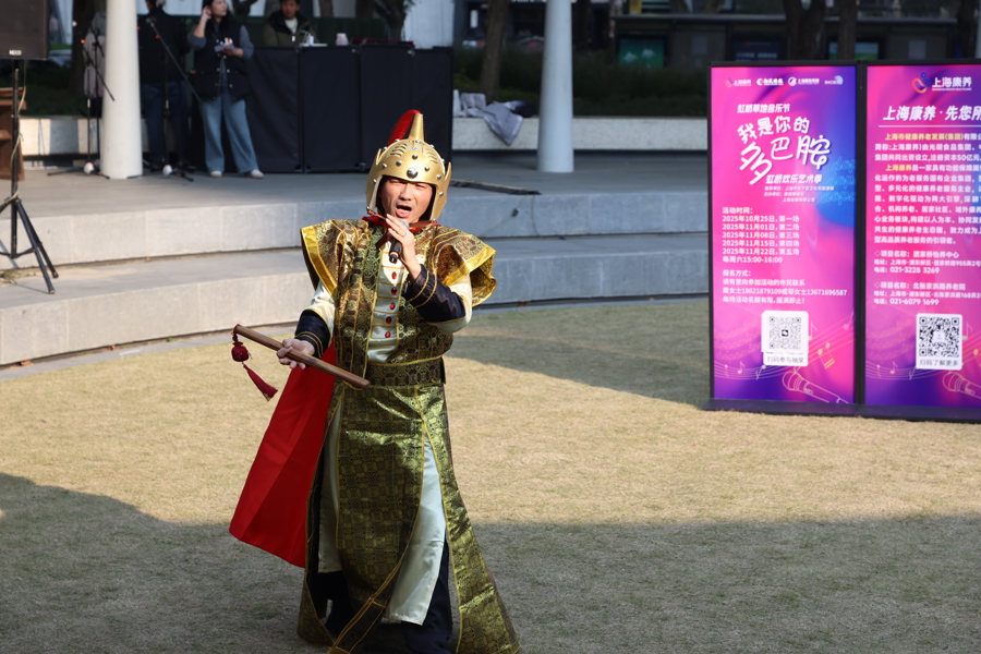 11月22日下午,长宁区虹桥公园源亭草坪上歌声飞扬、舞姿翩跹,“我是你的多巴胺——虹桥欢乐艺术季”第四场活动热闹上演。市民们带来了歌曲、戏曲、舞蹈、古琴演奏等丰富多彩的节目,现场还设有“分贝PK”投票、观众互动学舞、红包抽奖等环节,共同打造了一场真正由市民共创共享的“多巴胺”文艺盛宴。