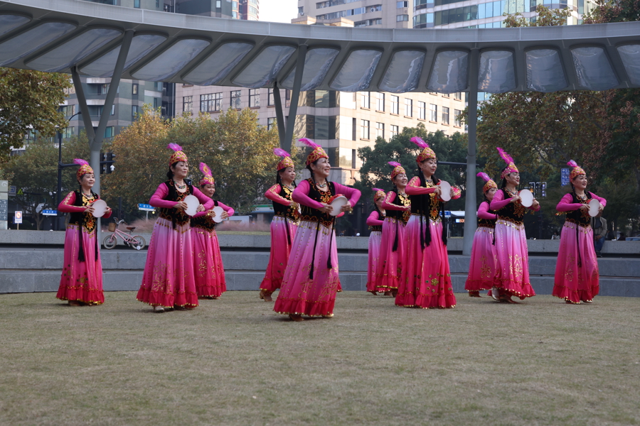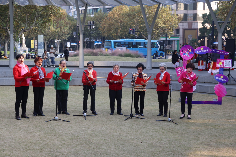 活动在激昂雄壮的《精忠报国》中拉开序幕,铿锵有力的男声瞬间点燃了全场热情。紧接着,长宁区茅台社区越韵曲艺班献上越剧选段《我把美酒献给你》,唱腔婉转悠扬,尽显江南戏曲的独特韵味。值得一提的是,八位表演者中,年龄最小的67岁,最大的已85岁。随后,古琴独奏《半山听雨》以空灵静谧的旋律,将观众带入一片山水意境之中;《思念》《花又落》《流光飞舞》等歌曲联唱,串联起一段“时光流转”般的音乐叙事,令人回味。阿依古丽舞蹈队带来的新疆舞《鼓声随响》节奏明快活泼,并在现场互动教学中掀起一阵“学舞热潮”;霞之韵女子组合深情演唱的《莫尼山》,情感丰沛动人,将整场气氛推至高潮。