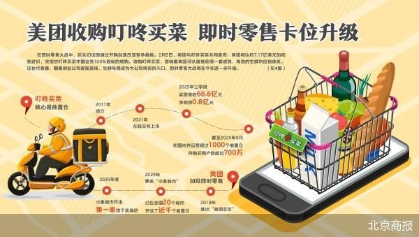 美团零售再扩版图。公告显示,美团高度重视即时零售业务,本次收购将有助于充分发挥双方在商品力、技术、运营等方面的优势,为消费者提供更优质的消费和配送体验。公开资料显示,截至2025年9月,叮咚买菜月购买用户数超过700万。