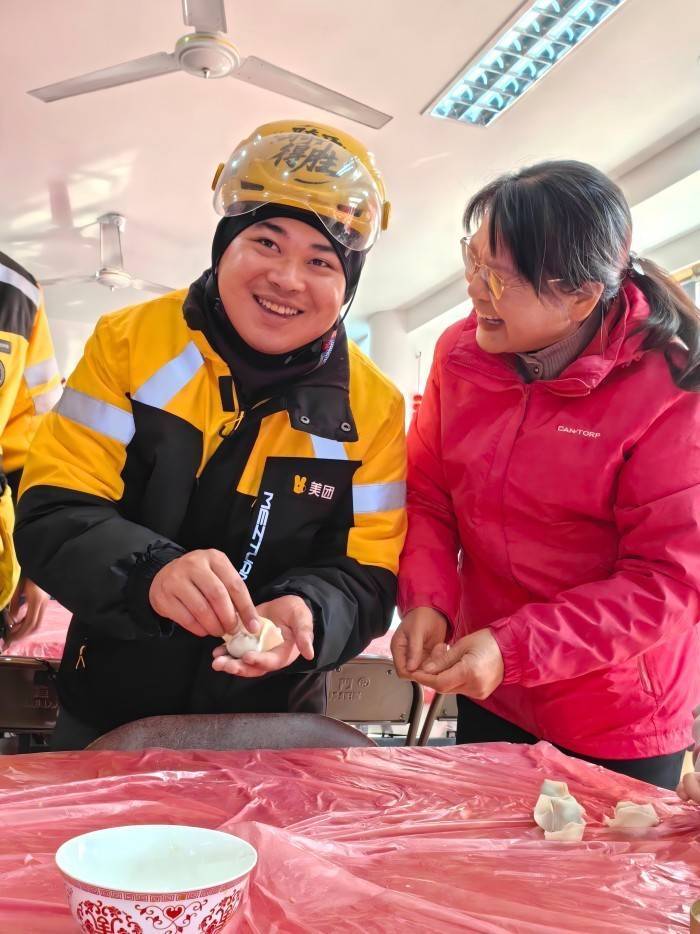 社区阿姨与社区志愿者教外卖小哥包馄饨。人民网记者 董志雯摄