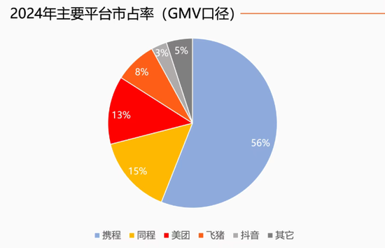 据交银国际测算数据显示,2024年携程在酒旅市场的GMV市占率达56%,与同程旅行(携程系)合计占据近70%的市场份额,远超美团的13%、飞猪的8%和抖音的3%,形成了一家独大的格局。