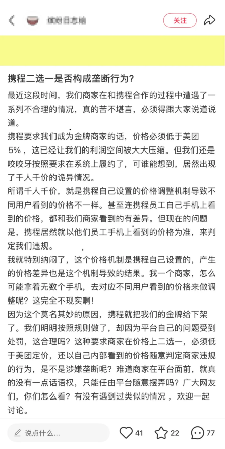 因为携程的不少行为,已经从单纯的商业竞争,演变为利用市场支配地位施加影响。