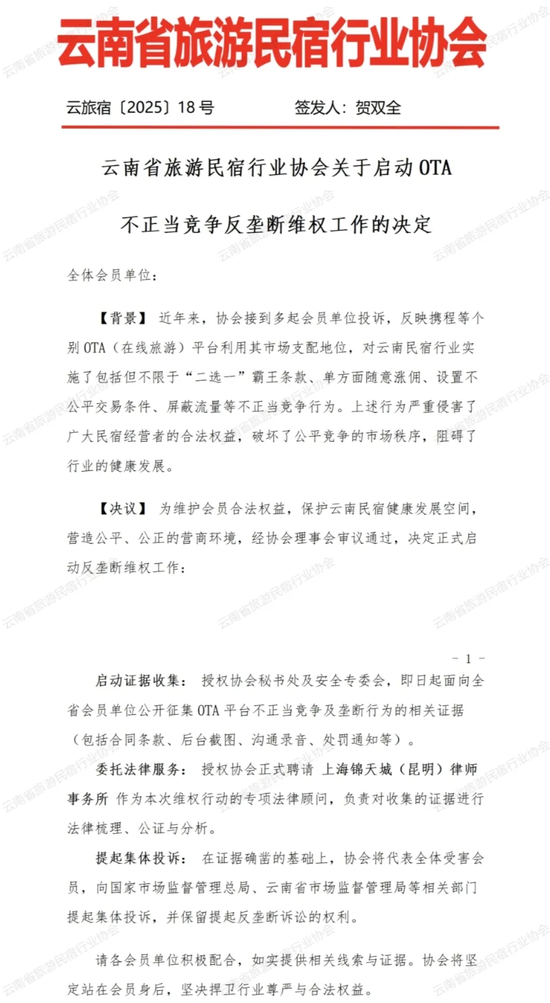 2025年12月8日,云南省旅游民宿行业协会通过官方渠道发布《关于启动OTA不正当竞争反垄断维权工作的决定》,正式向携程等在线旅游平台“宣战”。