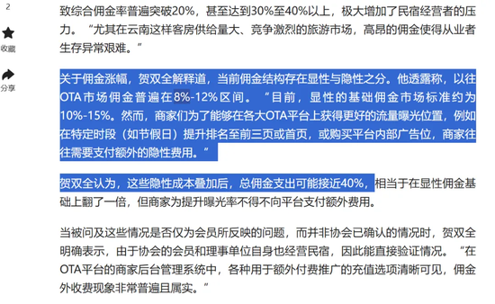 紧随二选一和定价权之后,是佣金与流量上的“剥削”。在云南爆发的维权事件中,会长贺双全就直言,携程佣金已从2020年的8%-10%涨到如今的12%-18%,快赶上民宿的平均毛利率了,再加上隐性收费、流量屏蔽,从业者根本难以为继。